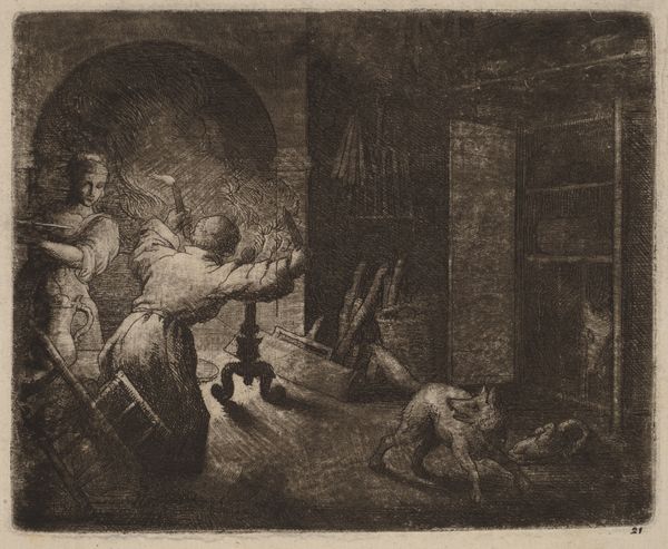 Curator: Stepping into a quiet domestic scene, we have before us Rodolphe Bresdin's etching, "Sainte Famille dans un Intérieur," or "Holy Family in an Interior." The date given is 1839-1885, spanning much of his working life, residing here at the Met. Editor: It's… intense, isn’t it? The light is practically swallowed by the density of the lines. The texture makes me think of velvet left out in the rain. But that intimate cluster of figures feels very safe amid all the visual noise. Curator: Yes, Bresdin's known for that very distinctive style, wouldn't you agree? It’s incredibly detailed, almost claustrophobic, really. Notice the sheer volume of engraved lines he's used to create such contrast within the small interior, which is indicative of the print medium of Intaglio used. Editor: Absolutely. Speaking of Intaglio and engraving, do you get the feeling that the father peering from behind them offers protection to the mother and child? Even in its darkness, this imagery carries a heavy, potent iconography. That the man peers and protects carries such strong historic weight here. Curator: He does. The figures are tucked near what appears to be a fireside with very dim illumination, drawing from a larger sense of how family structures protect the home from chaos and despair in times of hardship. It's almost theatrical, no? The dark and light playing off one another within that compact space. He seemed so immersed within nature scenes and dark tonalities, so his grasp of religious narrative here shows range and ingenuity. Editor: I like how you say that the use of theatrical light reminds me that there is drama in quiet devotion as much as anything else. It serves to almost amplify its iconography rather than muddle it. Perhaps, by leaning into contrasts and intensities in the Intaglio production method, Bresdin is signaling something that lurks in his and our psychological spaces. Curator: Definitely. There’s a hidden tension that almost asks us if there’s something more in store for the domestic setting, which for me feels very honest within religious-style imageries. Thanks to the artist, this etching holds a delicate sense of emotion when placed in conversation with the Holy Family in a home-like setting. Editor: You’re right. He seems to invite us not just to witness the Holy Family, but to reflect on what sanctity means within our own personal spaces. It really takes us deeper into intimate symbolism to sit alongside, rather than merely observe the family at a remove. Thank you for opening my eyes.
