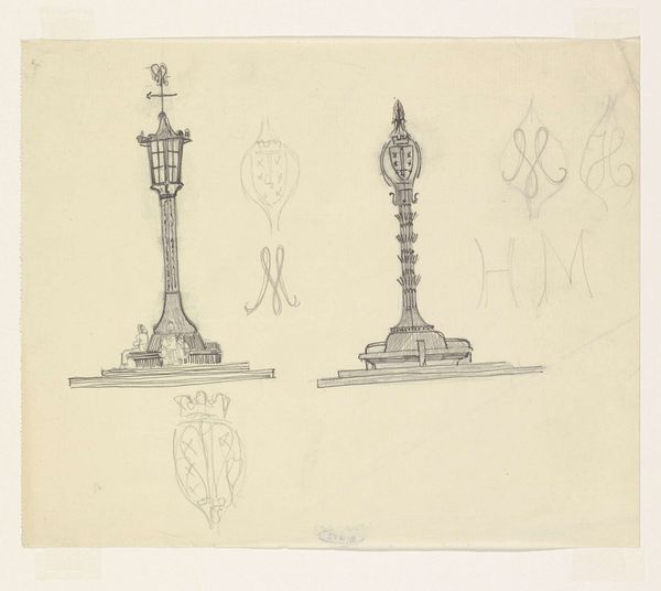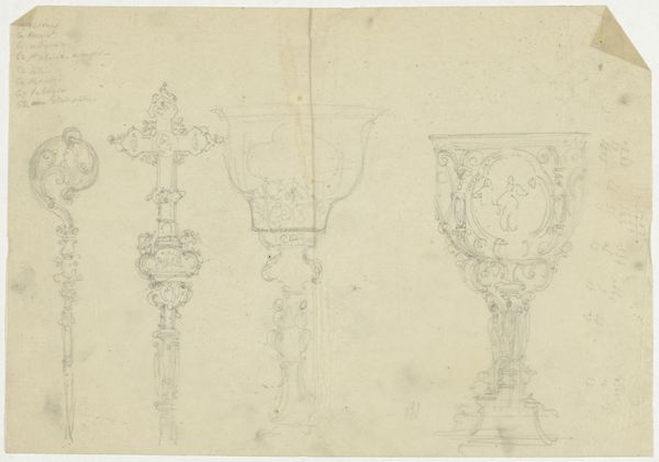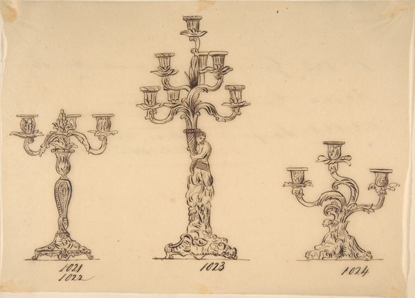 This is a pen and ink drawing for a sconce and two candelabras, made by an anonymous artist. The design features ornate, classical motifs, indicating its possible origin in 18th-century Europe, when a revival of classical forms in art and architecture was in vogue. The drawing provides insight into the decorative tastes of the upper classes, who would have commissioned such elaborate pieces for their homes. It demonstrates how art and design were deeply intertwined with social status and wealth. The lack of information about the artist and precise dating highlights the role of institutions such as museums in shaping the narrative around art. Understanding the social and economic context is vital for interpreting the significance of such designs. We can look into archives of decorative arts, period inventories, and design pattern books to better understand the cultural milieu that gave rise to such work.