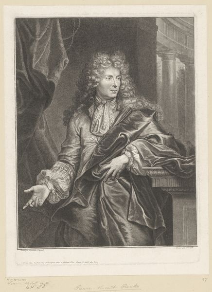 Hyacinthe Rigaud captured this gentleman's likeness in a drawing, embodying the ideals of status and intellect. The flowing wig, more than mere fashion, symbolizes authority and the social order. Note how the sitter rests his hand casually on a classical column. This posture, echoed in countless portraits across centuries, from Roman emperors to Renaissance nobles, denotes steadfastness and virtue, linking the sitter to a lineage of power. The column, originating in ancient Greece, represents strength and stability, yet here, it is softened, reflecting a shift towards aristocratic refinement. Consider the emotional weight of these symbols: the wig's artificiality versus the natural hand gesture. It is a dance between the constructed persona and the underlying humanity, an interplay that continues to resonate through ages. This symbolic language, deeply embedded in our collective memory, reveals how we perpetually negotiate identity and legacy.