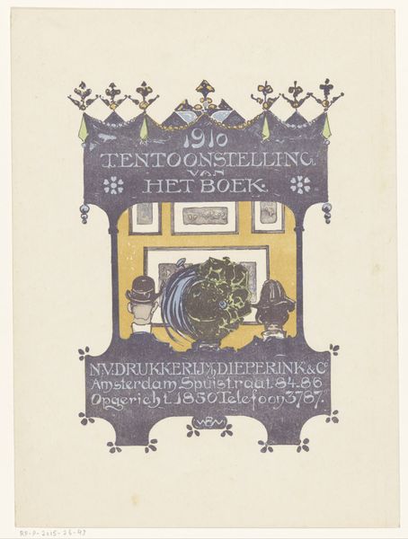 Curator: This cover design, executed by Reinier Willem Petrus de Vries in 1919, presents an intriguing fusion of geometric precision and fluid Art Nouveau sensibilities. The work uses watercolor and graphic art to capture our attention. Editor: Immediately, I'm struck by its almost heraldic quality, the confident symmetry. The pale yellow and blue create a sense of… well, perhaps restrained optimism, quite formal but still inviting, do you agree? Curator: I do, particularly in relation to its purpose. This was a cover for "De Bedrijfsreklame," a publication of the Association for the Promotion of Business Advertising. In the historical context, business was recovering after the end of WWI, and you see a sense of hope. I would argue it's carefully optimistic, conveying an industry ready to take flight, presented almost as a modern, clean emblem. Editor: So the symbol almost functions like a family crest for the burgeoning advertising industry itself? Curator: Precisely! Each carefully rendered flourish becomes a badge of professional pride. Consider also that the geometric pattern subtly underpinning the whole composition suggests structure, progress and order in commerce at that time. Editor: And I imagine the clean lines were a stark contrast to the heavy ornamentation that had previously dominated design, indicating a shift towards functionalism that influenced early modernism. It strikes me as the optimistic visual language of business ready to adapt. Curator: The colors too. The careful distribution of yellow and blue creates balance and a forward-looking statement in a time when businesses were reshaping the landscape. Editor: Thinking about visual symbols in a broader sense, the whole composition seems rooted in the visual vocabulary of idealized industrial progress. Very persuasive for any advertising body in 1919! I am especially taken with how effectively the artist merged this visual precision and these more decorative touches from Art Nouveau. Curator: It's a really compelling encapsulation of its moment in time, offering us a glimpse into a period of transformation and growth in advertising culture. Editor: Indeed, an enduring visual record of a nascent industry striving for legitimacy through carefully constructed symbolic forms.