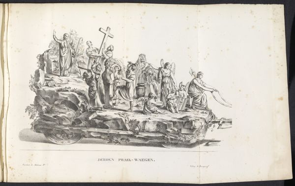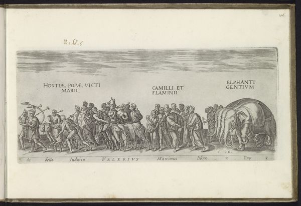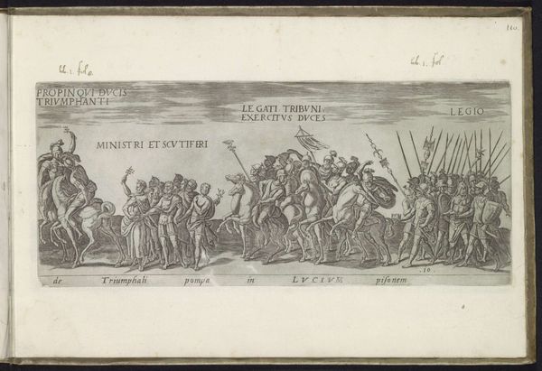 Curator: This detailed engraving, "Triomf processie met wagens met oorlogsbuit en mannen die kraters met munten dragen," dates back to 1618 and is attributed to Onofrio Panvinio. It depicts a triumphal procession. What stands out to you when you first look at it? Editor: It’s stark, isn't it? The strong lines emphasize the relentless nature of the procession, that insistent forward march. There's an air of conquest, but also a heavy, almost burdensome quality to all that loot. Curator: Precisely. These kinds of triumphal entries were major public events designed to solidify power, demonstrating military strength but also displaying wealth. Notice the varying objects— weaponry, gold, and silver vessels – each adding to the spectacle. Editor: The use of enslaved bodies as transport too – really makes it apparent who wins and who loses in this arrangement. What does that visual economy tell us? It is a parade for some, while simultaneously, subjugation of others. Curator: The artist seems preoccupied with presenting an accurate depiction of such a procession – a specific display of spoils in context – reflecting a concern with historical and social order. Note how even the inscriptions add layers of information intended for an informed public. Editor: In a way, the inscription becomes a powerful caption. It explicitly states who benefits, reminding viewers that behind the splendor of conquest, a human cost must be accounted for. The details that convey not celebration, but dominance. Curator: Agreed. By analyzing these public displays, we gain critical insight into how states legitimized themselves and shaped public memory through controlled narratives. The print becomes a historical record. Editor: And more than a simple historical record, it can be read as a critique of unbridled power – a demonstration of both triumph and oppression permanently inscribed together. A story about wealth built through injustice and on stolen artifacts, that carries profound contemporary significance, I think. Curator: Indeed, the engraving compels us to reflect not only on the past, but the continued echoes of these dynamics in the present. Thank you for highlighting these often-overlooked threads, helping to deepen our understanding of this Baroque print. Editor: Thank you. It's critical to dissect celebratory narratives and ensure our focus acknowledges who parades and who is subjugated during these events.