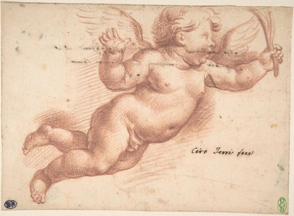 This red chalk drawing depicts a putto, a chubby male child, often winged, frequently found in Renaissance and Baroque art. Although the artist remains anonymous, the careful modeling and lifelike quality suggests it was likely made in Italy, sometime during the 16th or 17th century. The putto wasn't merely a cute figure. These images were deeply entwined with the social and religious culture of the time. Putti often appeared in religious paintings, representing cherubs or angels, so their imagery was commissioned by the church. But they also found their way into secular art, adorning palaces and villas as symbols of love, prosperity, and earthly delight for the wealthy elite. The institutions of religion and wealth shaped the demand for such images, employing artists to create these visual expressions of power and faith. To truly understand the putto, we need to delve into sources like period treatises on art, religious texts, and records of patronage. By considering the historical and institutional context, we can begin to grasp the multi-layered meanings embedded in this seemingly simple drawing.