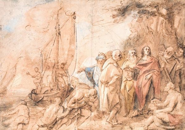 Curator: Standing before us is "David Offering the Head of Goliath to King Saul," an oil on panel work realized around 1627 by Rembrandt van Rijn. The painting narrates a scene from the Hebrew Bible, housed here at the Kunstmuseum Basel. Editor: Immediately striking is the use of light and shadow. It’s almost theatrical, with those rich browns and ochres dominating, drawing the eye to the central figures in a rather dramatic fashion. There’s a stark contrast at play. Curator: It’s important to understand this as an example of Dutch Golden Age painting. The patronage came not from the church, but wealthy merchants and civic leaders. So while this retells a Biblical story, it’s doing so in a context where the aspirations of the patrons needed to be elevated alongside biblical heroism. Editor: Note how Rembrandt stages the scene; he crafts it as an almost perfect pyramid of figures and bodies. Saul and David form the apex, down to the eager dog—a detail easily overlooked but cleverly framing the drama. It gives structure to the chaos of the celebrating army. Curator: Precisely! And notice King Saul. The portrayal is really something. We're not talking about an idealized ruler. The narrative of power, its display, and its negotiation become a matter for scrutiny here. Rembrandt offers a reflection on power, on war, and the precariousness of social standing in Dutch society. Editor: The loose brushwork really adds a certain urgency. This isn't about precise detail; it's about capturing a feeling, a moment. The rough application of paint creates textures that emphasize the humanity of these characters, the softness and vulnerability that resides in skin. It’s viscerally Baroque! Curator: What captivates me is how Rembrandt positions David. It's not just about the literal offering of Goliath’s head. David's placement underscores his social position and the implications for him of being the slayer. It's a commentary on upward mobility and shifting political winds within the Dutch Republic. Editor: Well, looking at the painting now through this lens, it's astonishing how much a composition can suggest and unpack. The mastery here lies not just in visual skill but in narrative depth. Curator: It becomes a study of public life during this pivotal era in the Netherlands. I appreciate how looking closely with you shows me all of this. Editor: Absolutely. A reminder that beauty and emotion can reside in the way art reflects both technique and content in surprising depth.