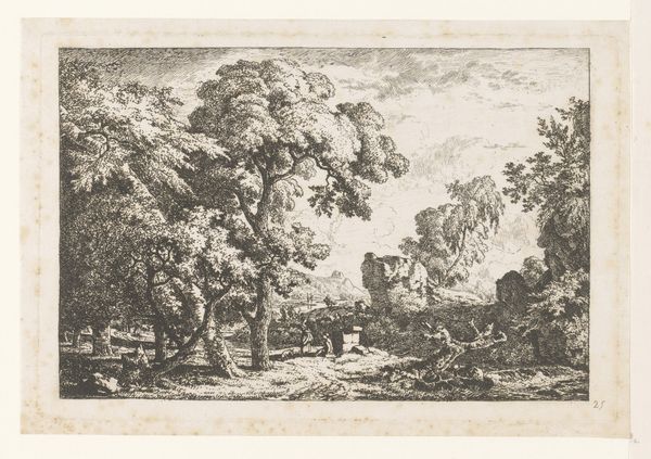 Editor: This is Allart van Everdingen’s "Winding River," an etching dating from about 1645 to 1656. I’m struck by how such a simple scene evokes a sense of peace. The winding river and the detailed foliage create such a relaxing atmosphere. What symbols or cultural meanings might you see here? Curator: I see the river not merely as a geographical feature but as a powerful symbol of time and transition, very common in art through the ages. Rivers have historically represented journeys – think of the River Styx in mythology, the passage from life to death, from known to unknown. In this Dutch Golden Age landscape, consider the etching technique itself; it mirrors the meticulous observation and symbolic depth characteristic of that period. Editor: So, it's not just about depicting a pretty landscape? Curator: Precisely. The trees, too, are significant. Their rootedness, their upward growth… What do they tell us? And look at how the light plays across the scene, defining forms. Is there a duality at play here? Is this scene merely literal? Editor: It could be suggesting resilience, like the way the trees adapt to the riverbank. I also noticed a boat far away! That looks like a call to adventure! Curator: Exactly. How do you see that interplay between detail and the wider scene affecting its meaning? Perhaps Everdingen uses detail to draw us in, then expands our view to the grandness of nature and the possibility of life. Think also of Dutch trade and exploration at this time - rivers were important communication lines! The 'Winding River' might remind contemporaries of how Dutch identity depended on the waterways. Editor: So the scene isn't just about what's in it, but what it represents. I think I'll definitely remember that rivers represent the passage of time. I appreciate you helping me interpret this today! Curator: A pleasure. Remember that artworks speak to us through a language of symbols, and we learn this language by practicing art historical literacy and appreciating nuance.