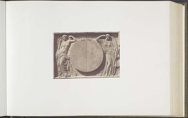 Edouard Baldus captured this image of Eugène Louis Lequesne's plaster models for sculptures at the Palais du Louvre. We see two winged female figures flanking a large, circular form. These figures, allegories of Painting and Sculpture, recall classical Greek sculpture. Winged figures often symbolize divine messengers. Here, they appear to be muses, bridging the terrestrial and the divine realms. The circle is an ancient symbol representing wholeness, eternity, and perfection. Its presence here could be understood as the embodiment of artistic creation itself, and a continuous cycle of inspiration. We see this motif of the winged figure throughout the history of art. Consider how the symbol of the angel, derived from classical antiquity, has been transmitted and adapted. It evolved through Christian art and iconography. These archetypes exert a powerful force, engaging our collective memory and subconscious associations. The symbols' emotional power lies in their ability to evoke a sense of timelessness. They appear, disappear, and resurface, evolving and taking on new meanings in different historical contexts.