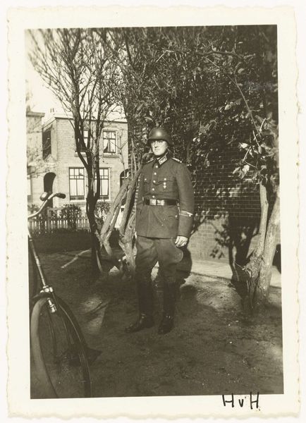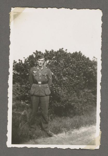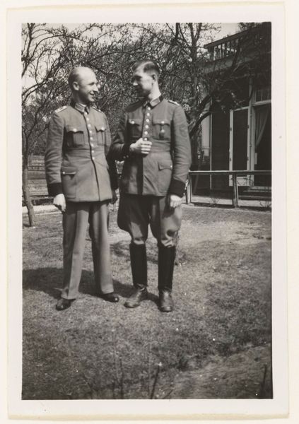This photograph of two uniformed military men was made by an anonymous artist. You know, the lack of detail really throws you. It's just a small black and white picture, nothing fancy, but the contrast is so strong. The light and dark areas create these sharp, defined shapes, which lends an air of authority to the figures. Their uniforms are crisp, almost severe. The way the light catches on the buttons and buckles makes them stand out. It’s like the photographer wanted to capture not just the men, but the idea of military order itself. The edges of the photo are a bit soft and torn, which sort of softens the effect of all that severity. It gives the image a sense of history, of being a thing that has survived through time. It’s a bit like some of Gerhard Richter's grayscale paintings, they evoke the weight of history and memory. But here, it's simpler, more direct. We’re left to fill in the gaps, to wonder about the story behind the image, and to imagine how the image might make us feel.