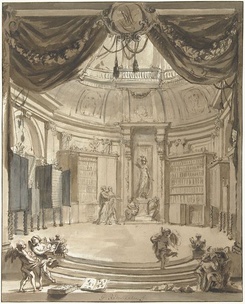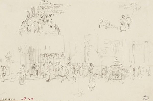 Curator: Tsuguharu Foujita's 1951 drawing, "Charpentier," is a delightful genre scene executed in ink and pen. Editor: It immediately strikes me as capturing a real sense of anticipation. The linear perspective draws you into the bustling crowd through the doorway. Curator: Absolutely. Foujita often explored social gatherings in his work, providing a window into the cultural elite of his time. Think of this as less a neutral record and more a pointed depiction of a highly stratified society. Editor: And yet, the elegance of the line work shouldn't be overlooked. The precision in rendering the architectural details, the ornate frames, and even the suggestion of fabrics. There’s a formalism here that speaks volumes. Curator: Agreed, the academic art style underscores the social codes being presented, almost as a critique of the elite's carefully constructed image. What could be the event on view to all these attendees? It certainly draws an intriguing contrast between those depicted within the artwork hung on the walls, and those assembled to admire art, in person. Editor: It certainly makes a bold choice by incorporating drawing media – ink, and pen – it manages to balance precision with a degree of fluidity and immediacy, the scene alive with energy. Note the hatching in the crowd—it suggests both a density of bodies and a vibrancy. Curator: Indeed. And how might Foujita's Japanese heritage inform his representation of Parisian society here? He positions himself as an observer, one keenly aware of the power dynamics inherent in cultural representation. Editor: Precisely. It all leads back to formal considerations: his careful arrangement of light and dark areas helps articulate a certain visual hierarchy, emphasizing specific figures in this narrative moment. Curator: This drawing compels us to consider who has access to the art world and what is seen as "worthy" of representation within such circles, revealing social and power relations. Editor: Indeed, beyond simply appreciating its technical virtuosity, examining the social forces that shaped this drawing adds to the artwork's layered complexity. It encourages multiple interpretations of Foujita's practice of linear strokes and detailed composition.
