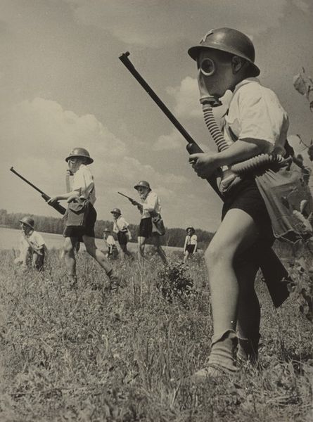 This photograph by Keystone View Company captures a regiment of women training, their forms arranged in a striking composition of contrasting shapes. The soft, rounded contours of their faces and clothing meet the hard, angular lines of the rifles they wield, creating a powerful visual tension. The use of monochrome flattens the image, emphasizing the stark contrast between light and shadow. This contrast isn't just aesthetic; it destabilizes traditional gender roles. The women's attire, seemingly domestic, clashes with the rifles, challenging fixed categories of femininity and militarism. The photograph's semiotic system uses the rifle as a signifier of power, conventionally associated with masculinity, now wielded by women. This subversion of expectations challenges conventional notions of power and gender. It invites ongoing interpretation, reflecting broader cultural and philosophical questions about the roles women play in society.