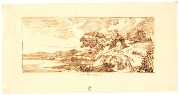 Curator: The artwork before us, created sometime between 1803 and 1848 by Martinus Rørbye, is titled "Landscape with Biblical Motif." It's a drawing executed in ink using a pen, currently housed here at the SMK. My immediate reaction is drawn to the figure in the lower-right, seemingly reaching towards the heavens. What do you see first? Editor: Well, the materialist in me zeroes in on the process. You have to admire the labor-intensive process using pen and ink to create such depth, especially within the landscape itself. You can really get lost in the texture here. But I can’t help feeling the starkness with which a religious narrative seems to clash with a very pastoral and pleasing landscape. Curator: That's a valid observation. This work evokes a longing and wonder typical of the Romantic era, drawing heavily on symbolism to convey profound spiritual meaning. That lone figure praying is key here: are they a representation of human suffering or hope? I mean, the Biblical aspect isn't immediately clear... it might almost be pagan, if you only looked at the nature. Editor: Yes, it’s subtle but look at the scale! That figure seems inconsequential within the vastness. The choice of materials further emphasizes this for me; ink on paper feels so fragile in contrast with what the image aims to evoke. I would question whether this very domestic art making has successfully achieved an elevated feeling beyond landscape drawing. Curator: Perhaps the artist wanted to explore that very tension. To place humanity in the face of something greater than itself. The ink medium might intentionally humble what would otherwise be a grandiose statement through oils or other processes. Editor: Maybe, or perhaps this was meant for a patron with particular tastes that had implications for the artist’s material condition… Food for thought! Curator: Indeed! The continuity of symbols remains relevant and powerful. The choice of subject alongside his choice of landscape makes you really feel Rørbye's emotional disposition as an artist. Editor: And from the perspective of social production, this intimate drawing provides glimpses into both the artistic conventions and labor practices prevalent at the time, all on one sheet of paper. A complex relationship!