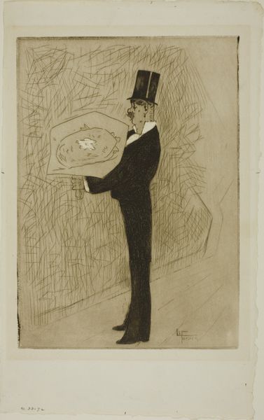 Curator: Here we have Henri-Gabriel Ibels’ lithograph, “Kam-Hill, from Le Café-Concert,” created in 1893. The work on paper currently resides here at the Art Institute of Chicago. Editor: The upward tilt of his head and arm gestures give the figure a striking sense of command on a brightly lit stage, don't you think? The stippling in the lithography certainly evokes the lively atmosphere of a cafe-concert. Curator: Indeed. Ibels’ choice of lithography, a relatively inexpensive and easily reproducible medium, is crucial to understanding the art's function. This was not meant for an elite audience, but rather a broader public engaged in the vibrant Parisian café culture. Editor: Note the striking simplicity in the rendering of the figure. The sharp, decisive lines describing the jacket and the contrasted shading indicating the stage floor; very economical but effective formal elements. Curator: It's worth considering the subject's role in this entertainment world. “Kam-Hill” was, presumably, a stage performer, perhaps even a caricature of one. The exaggerated pose might point to the spectacle of labor inherent in entertainment. The performer’s physical presence is emphasized, drawing attention to his efforts within the social and economic fabric of café society. Editor: True, yet it’s this very exaggeration of form that captures the *essence* of performance. The artist uses lines to guide our vision directly toward the head thrown back, further accentuating that open hand... These strategic gestures guide the reading. Curator: Perhaps. Yet consider the context: cafés as spaces of social exchange, even social climbing. Ibels, through accessible printmaking, is participating in the democratization of art, reflecting a specific moment in French history when art and entertainment became increasingly intertwined with commerce and leisure for wider populations. Editor: Still, there’s something enduring in the composition; how line and texture convey both weight and levity in such balance. Curator: It is through an investigation of materials and contexts such as these that we arrive at meaning in art and at that critical historical discourse. Editor: But without a focus on aesthetic intent—how colors speak, shapes play against each other, composition compels—art risks being reduced to a mere social artifact.