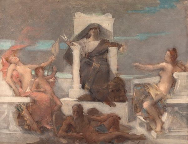 Editor: Here we have William Etty’s "Hero, Having Thrown herself from the Tower at the Sight of Leander Drowned, Dies on his Body". It's a powerfully tragic scene, rendered with such tangible flesh. What can you tell me about Etty’s approach to materials here? Curator: Etty's sensuous handling of paint, the very materiality of it, is key. He wasn't just depicting a scene; he was crafting flesh, using pigments ground by laborers, applied with brushes made by artisans. He was engaging with the entire chain of production inherent to creating art. Editor: So, it’s not just the subject, but the means of production that are significant? Curator: Exactly. Consider the societal implications of readily available pigments versus rarer, more expensive ones. The very act of painting becomes a commentary on class and access. Editor: That definitely gives me a new perspective! Curator: It highlights how the creation of art is so deeply rooted in material realities.