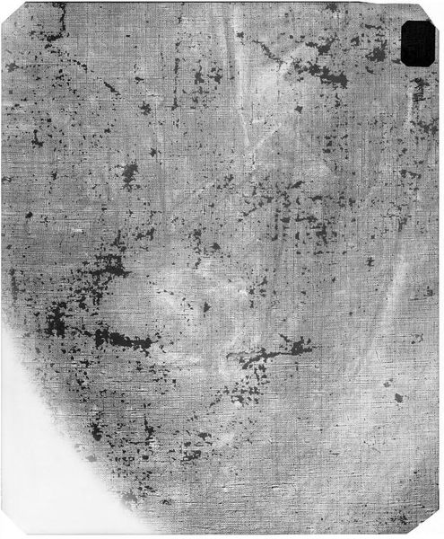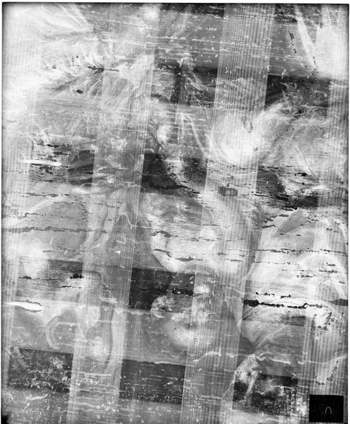 Curator: Immediately striking. The density of layered forms creates a strangely ethereal surface. Editor: Indeed. We're looking at an X-radiograph of "Portrait of a Man," attributed to Joseph Badger, located here at the Harvard Art Museums. The film measures 14 x 17 inches. Curator: The composition, viewed in this way, reveals hidden structures. Note the play of light and shadow—or, rather, density and transparency—across the canvas. The radiographic texture almost abstracts the portrait. Editor: It's fascinating to consider how this imaging technique allows us to see beneath the visible surface, hinting at the artist's process and the painting's history. Radiography, like art, is a culturally contingent mode of observation. Curator: Precisely. This process reveals how structural integrity influences our perception, transcending mere representation. Editor: It reframes art as both object and document, offering a glimpse behind the curtain. Curator: It also reminds us that unseen forces are at work at all times. Editor: An unexpectedly layered look at artistry.