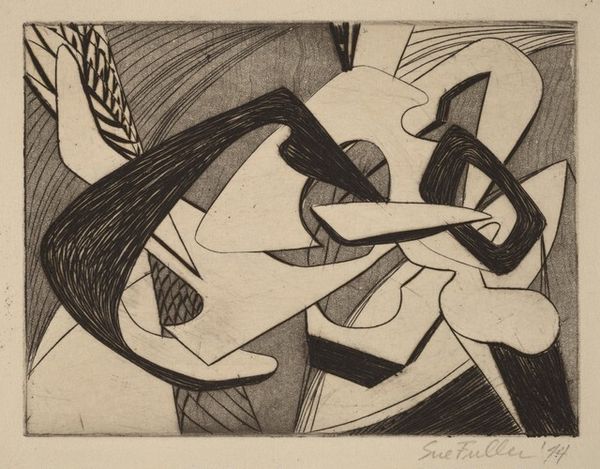 Curator: Welcome to this detailed mixed-media print titled "Masks I," created in 1985 by Craig McPherson. What strikes you first about it? Editor: The dramatic contrast immediately grabs me. The deep black background makes the monochrome masks seem to float, with the textures meticulously rendered. It feels stark and contemplative. Curator: McPherson's symbolism is potent, isn't it? The mask on the left appears shadowy, almost sinister, with the signature hooked nose that resembles plague-era carnival masks, while the right mask, seemingly covering its mouth with its hand, evokes enforced silence, or perhaps, the suppression of truth. Editor: Interesting observation. Focusing on formal qualities, observe how McPherson balances positive and negative space in these stylized and evocative features. This enhances its mysterious, almost dreamlike atmosphere. It evokes feelings of concealment, anonymity, perhaps even deceit. Curator: The very act of masking is inherently symbolic—hiding behind a facade, performing a role. We find masks in various cultures, signifying transformation, ritual, even rebellion against societal norms. Here, I am compelled to note a historical context: the plague, persecution, societal disruption... Masks serve both practical and symbolic roles within these events. Editor: From a visual standpoint, that dark void is strategically placed to draw focus on the shapes and textures. Consider how each mark, meticulously placed, accentuates and deepens the conceptual implications inherent in its form. The artist has masterfully employed a variety of printed marks with graphic intention and careful thought. Curator: Absolutely. McPherson uses figuration to tap into shared experiences across generations, compelling a visual memory of shared or inherited meaning, that reminds us of periods of significant change or fear in society. Editor: The monochrome palette further underscores this simplicity. It streamlines form, minimizing any potential distraction. I’d have to admit the lack of color encourages intense contemplation of its visual architecture. Curator: "Masks I," through its strategic and highly considered symbolic imagery, compels each viewer to engage in their own historical understanding and contemporary reading, asking questions not only of society but about the nature of individual identity in response to external pressures. Editor: It’s been intriguing exploring this print. Seeing how McPherson used composition to convey layers of meaning has certainly given me a renewed perspective on his choices.