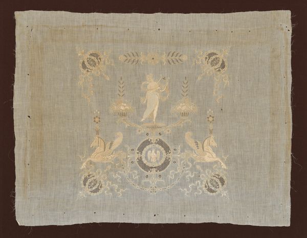Curator: Good morning. We're here today to discuss an exquisitely delicate piece from the Met's collection: a handkerchief created sometime between 1845 and 1855. It’s an impressive example of weaving, representative of decorative art styles, with text and heraldic design work, specifically in the form of imprinted textile. Editor: My initial response is simply breathlessness. The intricate lacework, the barely-there quality of the textile itself… it feels almost ghostly, a relic of a vanished, impossibly refined world. Curator: It's easy to see how you might arrive at that conclusion, given how handkerchiefs shifted to emblems of social identity within that period. These weren't utilitarian objects in the truest sense, though the practicality can not be fully dismissed, rather symbols representing status and access and markers of evolving class stratifications, notably between elite women during this time. Editor: Precisely. I'm immediately struck by the formal tension. There’s a rather stark contrast between the plainness of the central panel and the absolute riot of detail in the border. How might we interpret this relationship, this interplay of void and ornamented space? Is it to accentuate, and celebrate what lies inside? Is this in itself part of the piece's structural form, a sort of framing to direct the eye? Curator: Yes, in a sense you are absolutely right. The symbolic weight this "void" carries within this piece highlights the changing cultural importance placed on simplicity and unadorned grace as signifiers of elevated status—in contrast to more elaborate display and ostentatiousness found in past forms of visual display. Moreover, one has to recognize its status as an ornament of high quality with its inherent medieval aesthetic design roots—all combined within the smallness of the "miniature" context in which the textile has to inhabit, increasing both its structural weight as a statement of class and position. Editor: Which makes this textile a statement of power and luxury as well as an artistic symbol of the changing historical structures surrounding social presentation. It is so delicately constructed, though, almost as though the very patterns would dissipate with use; I am in awe. It makes me want to investigate other, similar pieces. Curator: It is pieces such as these that force one to think on the complexities of context when looking at decorative items with unique composition features. Let us move onto other such specimens.