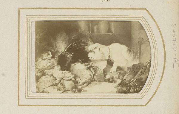 Robert Wilfred Skeffington Lutwidge, born in 1802, made this photograph, "Still Life and Embroidery" during a time when photography was rapidly evolving, yet still imbued with the aesthetic sensibilities of painting. Here, dead game birds hang against a backdrop of draped fabric. The image evokes the Victorian era's complex relationship with nature, hunting, and domestic display. Consider the historical context: these were times of expanding empire and burgeoning industrialization, where nature was both romanticized and exploited. The still life, traditionally a genre celebrating abundance and skill, here takes on a darker tone. The birds, once symbols of vitality, are now objects of the gaze, preserved through the new medium of photography. The detailed rendering of their plumage, juxtaposed with the delicate embroidery, speaks to a Victorian fascination with detail and a certain aestheticization of death. How does this image reflect the societal values and artistic conventions of its time, and what does it reveal about our enduring fascination with capturing and framing the natural world?