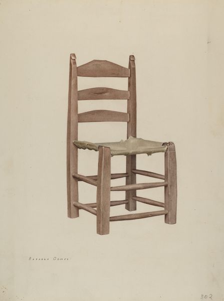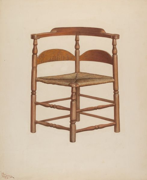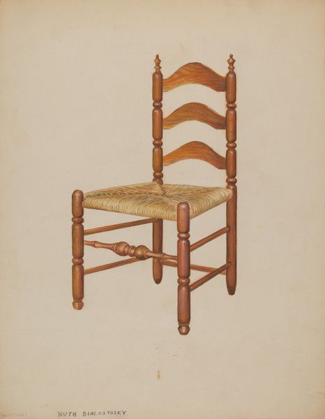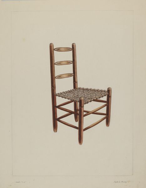 Curator: Right now, we're looking at Dorothy Johnson's "Double Back Chair" from around 1939, a piece rendered in pencil and watercolor. It strikes me, initially, as an exploration of quiet, utilitarian beauty. Editor: There’s something melancholy about it. The muted tones and stark composition almost isolate the chair, stripping away any sense of comfort. More like a ghost of a chair, a memory... Curator: It’s fascinating how the humble materials contribute to this feeling. We’re talking about graphite, pigments, and paper. Consider the socio-economic context – everyday objects rendered through accessible mediums reflect artistic concerns and priorities. What was valued, what was worthy of documentation. Editor: I suppose the humbleness attracts me... like the feeling of my grandmother's cottage or a back porch in late summer. It brings a familiarity of a quiet moment, the scent of wood and straw in warm air...it even lets you project forward to the warmth that has touched every groove and cranny...it is very quiet but I bet it whispers tales if you just sit long enough and think with it. Curator: Absolutely. It reminds us that the creation, distribution and interpretation of art is rooted in material realities. Each mark on the paper reflects decisions – access, resources, available tools – shaping the finished artwork and our interaction with it. You imagine the process itself, the movement of the artist’s hand... Editor: Right, like... was the chair real? Did she see it and then make something new or was she remaking one she has know for a while...or...am I over thinking it because the lines feel real, the light as the straw tells the time. So it had to have been felt somehow and translated and you end up sharing that translation through just looking. That makes a chair much more important. Curator: Precisely. Viewing “Double Back Chair” beyond a static image allows appreciation of the hands that formed and drew it, and its relevance to debates surrounding utility and design in the context of the era's evolving definitions of what defined art versus commodity. Editor: Looking again it feels the more special now... It brings a story I want to share just by me witnessing a rendition in graphite and wash. Curator: Exactly, that simple form can have so many echoes, even if, ultimately, it depicts a singular chair.