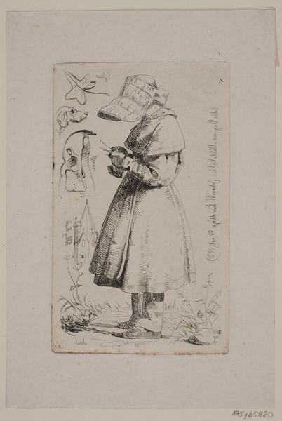 Editor: Here we have Johan Thomas Lundbye's "Little Regine in Vallekilde," from 1839. It's an etching, so ink on paper. I'm immediately struck by the figure’s clothing; it seems to denote a certain class and her task as a knitter. What do you see in this piece, looking at the way it was made and what it depicts? Curator: I see an image deeply embedded in its own social and material reality. Lundbye’s choice of etching, a readily reproducible printmaking technique, speaks to a desire to circulate this image beyond the elite. Think about the paper itself – likely a locally sourced material, handmade and hinting at the labour involved in its production. What does the knitting suggest to you about the girl’s expected future labour? Editor: I guess that it suggests her destiny will probably be more "hands-on," perhaps in a farm environment. It isn’t exactly the labour of a "refined" young lady. The etching emphasizes the detail of the coarse fabrics, highlighting the materiality of her existence. It isn't idealized, you know? Curator: Exactly. Consider how the image naturalizes a social hierarchy. Her dress, the tools she uses: these are all products of a specific economic and social system. The print makes that labor visible. Would you say it is then a critique or, maybe, an affirmation of the established class system? Editor: Hmm…good question. I think it’s more an honest, even romanticized, observation. Lundbye isn't necessarily condemning the situation but depicting it. What have we learned from this detailed rendition about production, labor, and how materials shape both the art and the subject’s life? Curator: We’ve hopefully realized that art is never separate from its material conditions. "Little Regine" becomes a window into understanding the intertwined relationships of labor, materials, and the construction of social identity in 19th-century Denmark. It gives us so much food for thought.