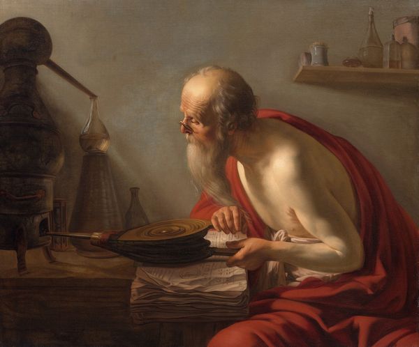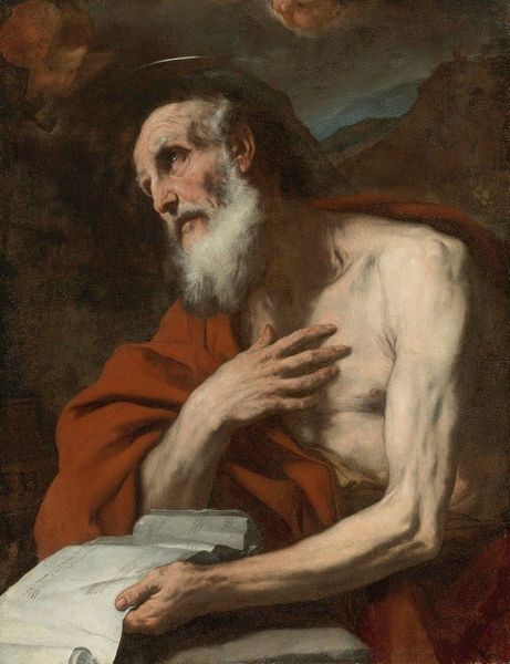 Curator: I would like to delve a bit deeper into Jusepe de Ribera's "St Jerome" from the 17th century. The striking chiaroscuro certainly adds a dramatic flair. Editor: Absolutely, it is hard not to notice the darkness that dominates this oil painting. St Jerome seems lost in thought as he is writing, almost meditative. A skull also lays by his side. What do you see in this piece? Curator: I see a reflection of the turbulent times and societal anxieties, captured through the lens of religious iconography. Ribera's choice to depict Jerome not as an idealized saint, but as an aged, almost emaciated figure, compels us to question the power structures that often sanitize and rewrite histories. His naked torso brings his human vulnerability to the fore, almost to invite you to discuss ageism or toxic masculinity, what do you think about this relationship between visual language and gender identity in Baroque art? Editor: I see that, yes, showing the saint with visible signs of age humanizes him, removing that untouchable quality you often see in depictions of religious figures. So the nude becomes a tool? Curator: Precisely! Consider how the very act of representation becomes a political act. It forces a confrontation with the realities of human existence often overlooked. It serves as a silent protest against oppressive norms. Editor: This piece, initially seemingly simple, carries such complex commentary about that period's societal and cultural anxieties. Curator: Indeed, it invites us to reconsider how art can function as a form of resistance, challenging dominant narratives, particularly within the history of gender representation. It leaves one thinking about our present context and power struggles, doesn’t it? Editor: I appreciate your interpretation, thank you. It gave me new perspectives through which I will observe all art in the future!