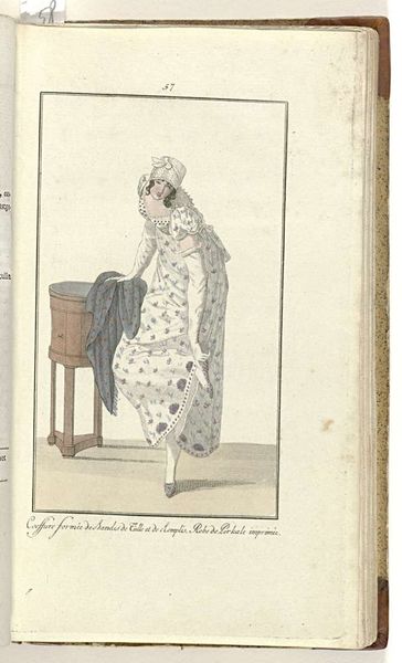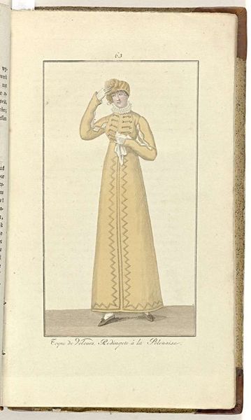 Editor: Here we have an image from 1809, titled "Elegantia, of tijdschrift van mode, luxe en smaak voor dames, November 1809, No. 94: Turban de Mousseline...", an anonymous watercolor and print. The figure is slender, elegant, and gives an impression of subdued grace. How do you interpret this image in the context of its time? Curator: This fashion plate, while seemingly a benign illustration of early 19th-century attire, actually speaks volumes about the socio-political currents swirling through Europe at the time. The very title, with its emphasis on "mode, luxe, and taste," points to the rising importance of consumer culture and its intersection with femininity. This woman isn't just wearing clothes; she's embodying a certain ideal. Editor: An ideal of what, exactly? Curator: Consider the "Turban de Mousseline." Turbans were not traditionally European. Their popularity then stemmed from orientalism, itself a product of colonial expansion and a fascination with the "exotic." So, even a simple turban becomes loaded with implications of cultural appropriation and power dynamics. The high-waisted "Redingote de Livantine," evokes similar connections, suggesting influences of trade and conquest. Editor: So the image isn't just about fashion, it's about global power? Curator: Precisely. What is considered "fashionable" often reflects broader geopolitical realities. How are women being used as vessels for national, economical, and political agendas? Fashion plates were instrumental in disseminating these messages, shaping desires, and solidifying class distinctions. How do you see the illustration, from this point of view? Editor: I guess I see how that one image shows how complex and layered things really are. Curator: Absolutely, and interrogating art with questions about the construction of identity helps uncover some challenging narratives.
