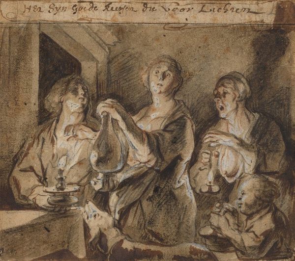 Curator: Jean-Baptiste Greuze created this work around 1761, titling it *The Marriage Contract*. It's rendered in delicate pencil and watercolor washes. Editor: My first impression is the intimacy of it. Despite the crowd, it feels so…enclosed, domestic. The limited palette, mostly browns and grays, contributes to this somber mood, doesn't it? Curator: Absolutely. The subject matter itself is weighty. A marriage contract signifies not just love, but social and economic alliances. Notice how the light falls upon the older figures, seemingly bestowing authority. Greuze uses this lighting to underscore the seriousness of the event. Editor: I am more interested in the physicality of the image itself. I see layers of drawing and color working almost like stages in a workshop. It has the appearance of something unfinished. What kind of labor do we suppose that involved? What status did such images command? I wonder who his clients were, too. Curator: Genre painting became highly popular. Greuze's naturalism and focus on domestic life certainly resonated. This is where his use of symbolism really comes to life, creating layered and meaningful narratives. Think of the contrast in the attitudes. While one person is eager about it, several seem reluctant to join it, and several others support it! Editor: The means of creating such an image meant a slow form of reproduction; even in this “quick” medium, the circulation of its motifs must have involved entirely distinct methods, compared to how similar images would now circulate across media. Did it democratize them at all? Curator: The symbolism used would not have been very inclusive in that way. But it opened new grounds in representing sentiment, that could affect many different types of patrons. I suppose it did, if we take it from that point of view! Editor: It’s all just so fascinating, thinking about how these scenes get materialized and re-materialized as time moves on, and how different viewers relate to them materially and aesthetically! Curator: For me, it's fascinating how Greuze could use such simple materials to express a timeless story about power dynamics, expectations, and the complexities within a family.
