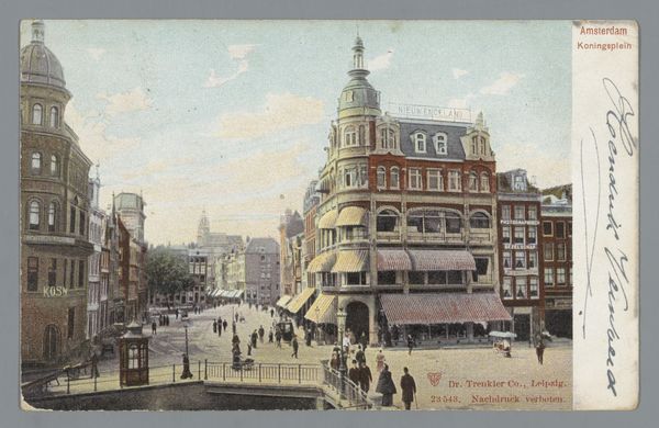Curator: Immediately I get a strong sense of a vanished world—this gelatine-silver print, probably produced by the photography studio Gebr. van R. sometime between 1880 and 1900, captures a view of the Vijzelstraat from the Keizersgracht in Amsterdam. It’s like stepping into a sepia-toned dream. Editor: Yes, it does have that vintage postcard feel! It’s Amsterdam, alright, but so utterly different from the Amsterdam I know. The atmosphere is palpable—that grey, Northern light… It makes me think of old photographs found in dusty attics. What catches my eye most is that hazy effect—makes the details seem to dissolve into a dreamy blur. Curator: It exemplifies Pictorialism, which flourished during this era, and emphasized aesthetic beauty, soft focus and often, hand-manipulation of the photographic print, echoing artistic styles found in painting and etching. Photography at this time was asserting its position as a fine art, separate from straightforward documentation. Editor: It's interesting how they use the street scene to tell a story. Look at the people. What are they thinking, feeling? Is that someone hauling goods? And the signs, advertising office supplies and wholesalers. This ordinary day becomes something quietly extraordinary viewed with the distance of time. I could stare at this photograph for hours, inventing their stories. Curator: Absolutely, this street view transcends mere representation. Notice, also, how the perspective lines and tonal range compress into the middle ground, which adds a sense of bustle. But look at that quiet mood – the way Pictorialism could also sanitize what might be been an altogether less beautiful or sanitary scene at the time, is part of photography's social story, too. Editor: Right. So there is tension beneath the surface between artistry and reportage. You are making me wonder how much intervention might be going on here—dodging, burning, maybe some scratching. To what degree does that Pictorialist aesthetic become its own historical filter? Is this how they wanted Amsterdam to be seen? And, of course, we continue to shape how we understand such photography by framing it. Curator: Exactly. Our gaze participates in shaping history. A work like this speaks not only to a past reality, but the complex processes of how images, both then and now, play such active roles within broader cultural and social forces. Editor: I'm leaving this feeling almost melancholic, moved by both the beautiful light, and that potent reminder of lives lived—and vanished into the past. Curator: And, too, a deepened understanding of how photographs like this reflect an intersection of artistic intention, historical moment and continued reception over time.