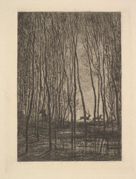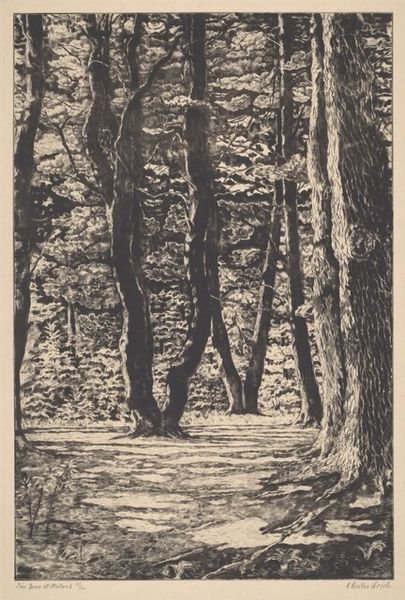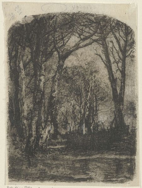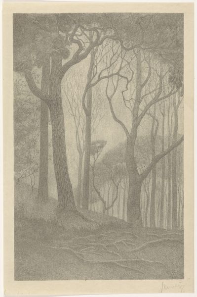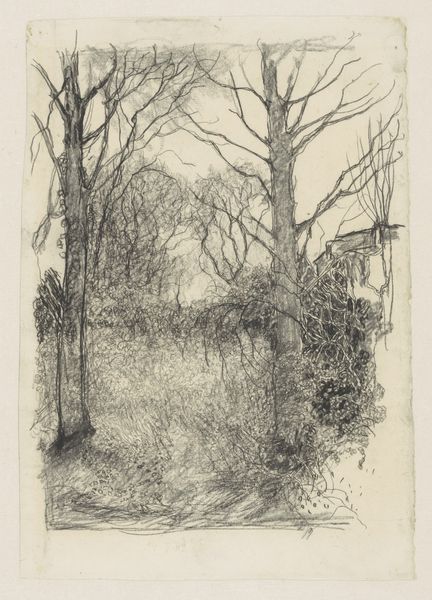 Editor: So, here we have Léon Spilliaert's "Sites Brabancons 2," a pencil drawing from 1919. It’s… very somber, I think. What strikes me is the texture of the pencil strokes, creating these dark, almost suffocating masses of trees against this narrow path of light. What do you see in this piece? Curator: I see a work deeply invested in the materials and processes of its creation. Consider the accessibility of pencil and paper, and the physical act of sketching. Spilliaert uses readily available, mass-produced tools, not rarefied artistic materials, to render what appears to be an observed scene. Look closely; you can see how the direction and density of the pencil strokes describe volume and texture. It becomes a study in how readily available materials can shape a viewer's perception. Editor: That's interesting. So, you are focusing less on, say, the symbolism of the dark woods, and more on the physical act of creating the image? Is it because the pencil allows more detailed work? Curator: Precisely. What would this scene look like if he’d employed charcoal or conte crayon? The impact of materials shapes both artist execution and reception. In that historical period, there was an interesting cross over where art was being mass produced, do you see the connections between the artist’s chosen medium and industrialization? Editor: I think I get it! It’s not just about representing a landscape; it's about the relationship between the artist, their tools, and the larger socio-economic forces at play at the beginning of the 20th century. It gives you a deeper consideration of landscape as a genre of artistic practice. Curator: Exactly. By understanding the conditions of production—the materials used, the labour involved—we gain insights beyond just the aesthetic appeal of the image. We also gain more awareness of accessibility in art forms to be inclusive in its impact. Editor: I will keep that in mind moving forward when viewing new artwork. Thanks for pointing out the materiality aspect!