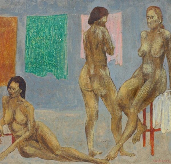 Zinaida Serebriakova, a Russian artist, made this pastel drawing called ‘Bathing’, though it's difficult to precisely date its creation. In the early 20th century, the nude form was a contested space in the art world. Historically, it had been the domain of male artists, often objectifying women. Serebriakova, as a female artist, offers a different perspective. The bathers are not idealized or sexualized; instead, they are portrayed as strong, active, and at ease in their own bodies. Consider the historical context. Russia at this time was undergoing immense social change, and traditional social norms were being challenged, also influencing artistic expression. As historians, our understanding of this piece is enriched by researching Serebriakova's biography, as well as the broader social and artistic movements of her time. These resources help us understand how she both reflected and challenged the norms of early 20th-century Russia. Ultimately, this artwork's meaning is deeply intertwined with its socio-cultural moment.