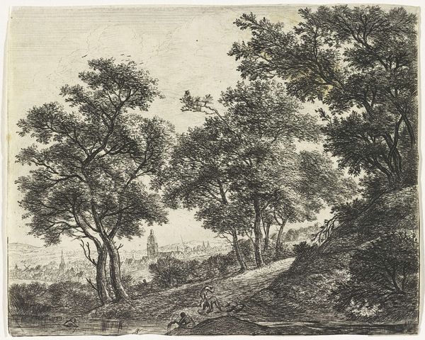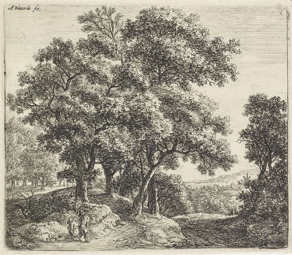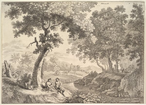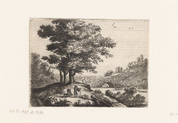 Curator: Welcome! We’re looking at "Twee figuren op een heuvel bij een huis," or "Two Figures on a Hill Near a House," an etching attributed to Anthonie Waterloo, created sometime between 1630 and 1675. Editor: It’s a remarkably detailed etching. The scene evokes a quiet stillness, like a brief respite from the world for the two figures resting there. There's almost an innocent peace radiating outward. Curator: Waterloo’s skill really shines in depicting nature. The looming tree dominating the scene might symbolize protection, perhaps even fertility with its sprawling presence. But note how these figures, seemingly small and insignificant, find solace at its base. Considering the social climate of the Dutch Golden Age, where ideas of domesticity and piety were gaining significance, it's possible the location offers a space where social status dissolves under the embrace of nature, though in reality access to rural land wasn't open to everyone. Editor: You see a maternal quality in the tree, I notice a sort of guardian figure aspect too. It reminds me of a similar image in an earlier emblem book where a sheltering oak is depicted, guarding a small house from some kind of symbolic turmoil. It implies not just safety, but a deep connection to tradition and rootedness. Are those figures a couple, a mother and child, or just friends sharing a quiet moment together? They certainly convey a sense of safety near the stream. Curator: Precisely. While their individual identities remain obscured, what they collectively embody is a deep-seated connection to their land and community, with themes prevalent during this era. Even though class structures confined interactions and land ownership for many, within these artistic representations there is that shared aspiration toward domesticity, however unevenly applied at that time. Editor: The presence of the water symbol, too; cleansing, renewal and reflection—it underscores the spiritual undertones of the print and the importance of nature in daily life, regardless of station. Curator: Right, in summary, through the artist's skilled handling of landscape, domestic imagery and spiritual symbols, the composition really provides multiple points of entry. Editor: This artwork continues to stir new ideas about land, life, and art itself!