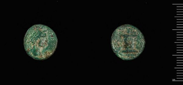 Editor: This is a coin of the Chalkidian League from Olynthos, on display at the Harvard Art Museums. It's small, heavily patinated in green, and quite weathered. What can you tell me about it? Curator: The wear is fascinating, isn't it? This coin speaks volumes about its material journey and the social context of its production and use. It’s a bronze object, likely created through casting or striking, reflecting specific labor practices and metallurgical knowledge. Editor: So, it's less about the imagery and more about how it was made and used? Curator: Precisely. The coin's value isn't just monetary or symbolic. It’s rooted in the resources extracted, the labor expended, and its role within networks of exchange and power dynamics. Does considering it this way change your perspective? Editor: It does. I hadn't thought about how the coin's materiality connects it to so many different processes and people. Thanks! Curator: My pleasure! Examining art this way reveals deeper connections than just aesthetics.