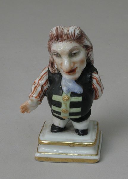 Editor: This delightful little sculpture is called "Dwarf (one of three)", made of porcelain by the Doccia Porcelain Manufactory between 1755 and 1775. It’s smaller than I expected, and his expression seems surprisingly cheeky. What do you make of this piece? Curator: Ah, yes! This is part of a set, and these figures carry potent cultural weight. These weren't simple decorations; they speak to a complex fascination with otherness. The carefully rendered details—the striped stockings, the oversized head—aren’t arbitrary. Editor: So, it's more than just a whimsical figurine? Curator: Precisely. Think about the role of dwarfs in folklore and mythology. Often, they are figures of transgression, existing outside social norms, sometimes even possessing magical powers. His stance, the slight smirk... what could that symbolize? Editor: Rebellion, perhaps? Or just…defiance? It feels like he knows something we don't. The hat, too, is that of an outmoded merchant. Curator: Exactly. That’s fascinating because clothing acts as a visual shorthand. He is both comical and knowing; perhaps representing societal unease at social mobility at the time of production? So, who has the real power here: the established order or this "dwarf?" Editor: Wow, I never thought of it that way. I was so focused on the comical aspect, but there’s a whole world of symbolic meaning I completely missed. Curator: That's the joy of exploring art – unearthing those layers of meaning. Images hold a mirror to society, reflecting both its conscious values and its subconscious anxieties. Editor: Thanks for helping me see so much more than just a funny little statue!