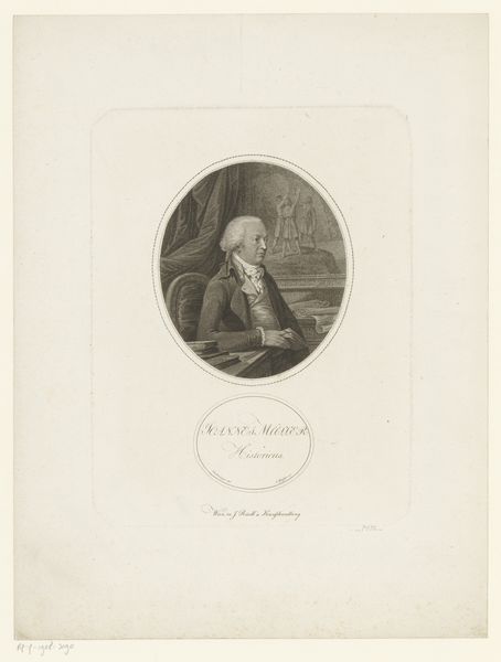 Curator: Here we have Tony Johannot's "Portret van René-Aubert Vertot," an engraving from 1822 currently residing at the Rijksmuseum. Editor: My first impression is a feeling of restrained formality. The figure sits bathed in soft light, and yet there's a certain rigidness to his posture that gives off an air of self-importance, a real performance of authority. Curator: That resonates with what we know of Vertot and the socio-political dynamics of the era. The subject, René-Aubert Vertot, was a historian during the Enlightenment; an important figure, not only in his field, but a member of French high society and the clergy. Think about who could commission such a portrait at the time. How would one use this image of Vertot? Who benefits? Editor: Precisely. In that context, consider how this image intersects with concepts of power and knowledge dissemination. Look at him seated at his desk—the trappings of scholarship and academia laid out for the viewer, yet his hand is ever-present, not actually writing, as if pausing to address someone in court. Is this simply a portrait or propaganda? Curator: I agree it's more than meets the eye. It embodies the era's complex relationship with history itself. In many ways it perpetuates an inherently male, largely white and affluent point of view, while consciously suppressing alternative perspectives of Vertot's world. Can the social standing of the historical actors distort their legacies and thus subsequent analyses of art produced within that moment? Editor: An interesting perspective. And while Vertot certainly participated in systems that benefitted his own class and kind, there are additional threads worth exploring here. Consider the technical aspects: the engraving's neoclassical style harkens back to Roman and Greek aesthetic ideals. Do the choice of style and medium influence its reception within contemporary audiences? Does that reinforce an image of timeless erudition? Curator: Certainly, neoclassical aesthetic sensibilities shaped not only art, but social and political aspirations, serving specific cultural goals. The scale and monochromatic quality contribute to its authoritative presence. We're confronted with this image of a learned man who may consciously, or unconsciously, embody values perpetuating hierarchies and inequalities. Editor: A vital layer to understanding both the artwork and its cultural impact, emphasizing the responsibility we have to unpack and critique ingrained biases, past and present. Thanks for adding this crucial point. Curator: Likewise. It's a conversation we must continue having.