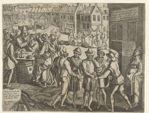Curator: Here we have "Brothel Scene" by the Brunswick Monogrammist, likely rendered between 1540 and 1550 using oil paint. The artwork is currently housed at the Städel Museum. Editor: Immediately, I’m struck by the dense composition and muted palette. It's like observing a bustling microcosm, yet there's a certain stillness achieved through the artist's layering and subtle use of light. Curator: Genre paintings of this kind offer fascinating glimpses into the social dynamics of the 16th century, reflecting societal attitudes toward sexuality, class, and morality. This scene could represent more than a brothel; it may be a critical commentary on social decadence. Editor: Look at how the artist balances horizontal and vertical elements—the strong vertical lines of the doorway juxtaposed with the figures gathered around the table. This creates a sense of enclosure and intensifies the interiority of the scene. There’s an almost geometric order underlying the apparent chaos. Curator: Absolutely. Moreover, the symbols embedded within the image invite interpretation. The instruments suggest merriment but perhaps also a loss of control, and the gestures among the figures underscore power dynamics and the transactional nature of relationships within this setting. How do these figures reflect broader roles within society? Editor: Semiotically, the clothing speaks volumes—the sumptuous fabrics contrasting with the worn attire hinting at the varied social strata represented. And the interplay of gazes locks us, the viewers, into the role of voyeurs, forcing us to question our position in relation to what's unfolding. Curator: Considering the Reformation era, the overt display of indulgences becomes increasingly meaningful. The painting raises critical questions about societal norms and their subversive defiance by these figures, making it less about lewdity and more about protest against an unjust system. Editor: Observing how light interacts with the forms—note the faces cast in shadow—introduces an element of chiaroscuro, adding dramatic tension and lending psychological depth to these figures. Despite its small scale, it holds an enormous sense of enclosed drama. Curator: Understanding how it functions as a historical text allows us to extract commentary on labor and leisure, exploring agency for women and scrutinizing the behaviors of men within specific socioeconomic structures. Editor: Examining its architecture through these arguments adds compelling richness to this seemingly straightforward genre scene. It provokes deeper reflection beyond what might first meet the eye.
