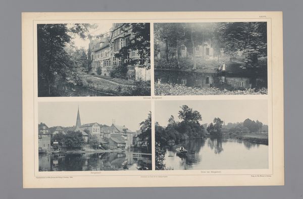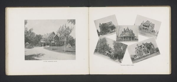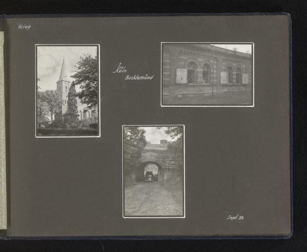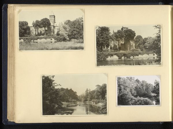 Curator: This work, created around 1940 by Norbert van den Berg, presents a photographic album page titled "Vier foto's van huizen en tuinen in Laren" -- that is, "Four photos of houses and gardens in Laren." Editor: It's interesting how these black and white photographs, especially the ones of the garden arbors, carry a mood of subdued, almost haunting tranquility. There’s something about the stark contrast and repetitive lines of the pergolas that draw me in. Curator: The timing of these photographs, taken during the early years of the Second World War, casts a significant shadow. Laren, a village with a history of artistic community, became a refuge for some, while others faced increasing danger. These images, depicting serene gardens and domestic architecture, represent a specific kind of privilege and perhaps even denial amidst escalating turmoil. Editor: I'm struck by how van den Berg uses light and shadow to create depth and texture, particularly in the photographs of the gardens. Note how the eye is led through the covered walkways with careful framing, using compositional balance. The realism with which they're rendered offers an intimacy, but there's also an impersonal quality about these structures in themselves. Curator: Indeed. One could consider these photographs in light of the Dutch concept of "gezelligheid," or coziness. However, during wartime, such idealized portrayals of home and garden took on complicated layers of meaning. While the houses might literally stand as symbols of shelter, the notion of home was being challenged for displaced people all across Europe. Editor: Viewed now, decades later, the subdued palette contributes to that pervasive melancholic mood. Do you think that was the intention of van den Berg when choosing the materials? Curator: I’m not sure about intention per se, but as a reflection, these images create dialogue between public facade and personal trauma of the era. The contrast between the calm scenes captured in these photos and the turmoil outside these garden walls gives these works much of their weight. Editor: I find myself continually drawn back to these black-and-white geometric shapes that create depth. What began as observation about the photographic rendering in fact becomes quite representative and self-reflective as we consider these gardens of wartime.