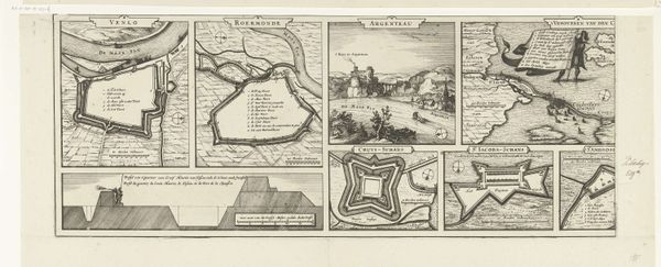 Editor: This is Claes Jansz. Visscher’s "Siege of Maastricht, 1632 (plate 6)", an engraving from 1633 at the Rijksmuseum. It’s so intricate, almost like a technical drawing, but with these little vignettes of each location. How would you interpret the visual language being used here? Curator: Think about maps not just as representations of space, but as symbols of power and control. This isn’t just showing you where Maastricht is, but also communicating Dutch military prowess. What visual cues suggest that? Editor: Well, the level of detail gives it an air of authority. Each little town looks planned and strategically important, laid out almost mathematically. Curator: Exactly! These carefully delineated boundaries are assertions of dominion, but look closer – what are the names of these fortifications, and do they resemble shapes that you recognize from daily life? Are these merely maps? Editor: I see what you mean. There’s Straelen which resembles a perfect square. How about Orsoy, it vaguely looks like a star, maybe signifying… divine protection? The symbols of these shapes, plus the very act of mapping itself is claiming symbolic control? Curator: Precisely! Mapping was deeply intertwined with the concept of asserting a sense of power during the baroque era. Even something like the river might symbolize a lifeblood. Now think about who would have seen and interpreted this image, what narratives would this symbolic geography create, or reinforce? Editor: This really challenges how I usually understand maps – less as objective tools, and more as carefully constructed narratives. It is as if you can plant memories, ideas and claims, simply by pointing out how you wish to perceive something! Curator: And consider how we still use visual shorthand and established representations to this day! Perhaps those symbols never fully left our collective consciousness.