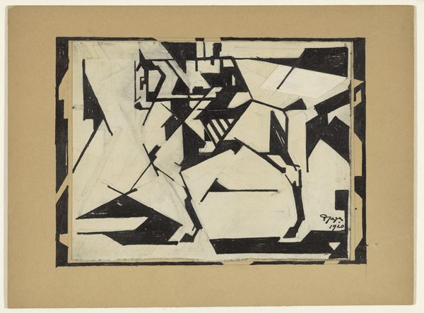 Editor: Reijer Stolk’s "Man en Paard," or "Man and Horse," made around 1921. It's an etching, giving it this intense, scratchy texture. I'm really struck by how fragmented the forms are – the man and horse almost seem to be dissolving into these geometric shapes. What sort of cultural associations do you think might be in play here? Curator: Well, look at how the horse and rider are almost indistinguishable from the abstract environment around them. Stolk wasn't just depicting a man on a horse; he was engaging with the symbolic power this pairing has had throughout history. Consider the classical equestrian statue—a symbol of power and dominance. Now see how Stolk is radically breaking that down. Editor: So it's like a deconstruction of a classic image? Curator: Exactly. The fragmentation suggests a world where traditional hierarchies and established forms are questioned, perhaps even collapsing. Notice how the etching technique itself, with its rough, uneven lines, contributes to this sense of instability. The rider isn't triumphant, they're… almost battling the geometry, isn't it? What emotion do you derive from this piece? Editor: I definitely get a sense of struggle. Maybe not violent, but definitely tense. Like he's fighting against… something unseen, perhaps the societal shifts occurring during the early 20th century? Curator: Precisely. The stark, geometric forms also have roots in the visual language of Modernism; consider the simultaneous flattening and reconfiguring of space – perhaps reflective of the period’s wider cultural anxieties concerning established viewpoints. What do you make of that spear he carries? Editor: It seems less a weapon, and more a… tool, almost? A way of navigating that broken world. Curator: Yes. Stolk has taken enduring imagery and stripped away its straightforward associations. This allows for more complex and personal associations to develop for viewers even now. Editor: I never thought about how loaded an image of a man and a horse could be. Looking at it now, there is this feeling of re-examining our cultural foundations. Thanks so much.