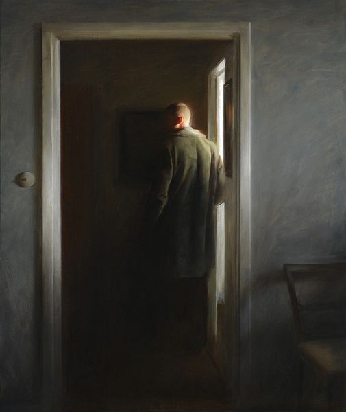 Curator: This is Paul Winstanley’s “Woman at a Window 2,” housed here at the Tate Collections, its support measuring a substantial 1350 x 1550 mm. Editor: It's quite somber, isn't it? The muted palette and the woman's pose suggest a moment of introspection or perhaps a touch of melancholy. Curator: Indeed. Note how Winstanley employs a restricted color range, primarily yellows and reds, which creates a certain flatness. The window operates as a compositional device, framing both the figure and the exterior world. Editor: Windows often symbolize transition, or liminal spaces. The woman could be interpreted as yearning for something beyond her immediate environment, a motif as old as art itself. Curator: Precisely. The geometry of the room and the figure's placement reinforce a sense of detachment. Editor: It is a powerful evocation of solitude, made all the more poignant by the simplicity of the visual language. Curator: It’s a masterful play on perspective, space, and the quiet drama of human existence. Editor: It is fascinating to think about the enduring symbols we carry with us when engaging with works such as these.