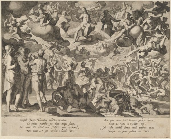 Curator: This print, residing here at the Rijksmuseum, is entitled *Een vrouw die haar man vertrapt,* which translates to *A woman trampling her husband.* Created sometime between 1610 and 1663, it’s the work of Cornelis van Kittensteyn, rendered using engraving techniques. Editor: It strikes me as quite chaotic! A rather imposing woman dominates the scene, and there's a frenetic energy to the composition. What immediately jumps out is her rather gleeful expression contrasted with the visible distress of those around her. Curator: That gleeful expression, I think, hints at the satirical nature of the piece. We see a figure, presumably the husband, literally flattened beneath her feet, his possessions scattered around him, a potent symbol of reversed roles and the perceived dangers of female dominance in that era. The overturned jug likely symbolizes the loss of household stability. Editor: Precisely! The jug speaks to broken roles within the marriage but notice too, the detail of what appears to be children reacting—one clinging to the woman, the other hiding. This all adds to the emotional layers, doesn’t it? The image certainly taps into deep-seated anxieties regarding social order. It is so interesting how period details like her cap or the shape of those jugs tie the emotional context to a historical world that felt those specific social fears in ways very foreign to us. Curator: And consider the print medium itself. These images would have been widely circulated, making this commentary accessible to a broad audience, solidifying the visual language surrounding gender roles and power dynamics. Editor: Right. The distribution amplifies the message. Was this typical for Kittensteyn to focus on social satires and marital themes like this? Curator: Yes, Kittensteyn was known for these genre scenes and caricatures. He cleverly used recognizable tropes, turning ordinary life into biting social commentary. Notice how he emphasizes caricature elements by using rather strong contrast and highly exaggerated features in order to drive home the satirical social commentary. Editor: It’s a complex dance then, isn't it? Using common cultural anxieties to provoke, perhaps even reinforce, specific ideas. It gives you a stark glimpse into that period's concerns. Curator: A fascinating window, indeed. It makes one consider how societal anxieties translate into visual representations that leave a lasting mark across centuries.