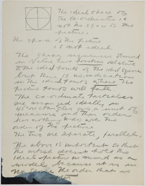 Curator: Here we have Stuart Davis's intriguing "Art Theory Text with C-Scale Object Diagram," its date, unfortunately, unknown. It’s ink on paper, 27.8 by 21.4 centimeters. The Harvard Art Museums hold this cryptic sheet. Editor: It feels like a secret code, doesn't it? A personal manifesto scrawled on a scrap. There's something almost obsessive about the density of the text and the diagram. Curator: Davis was obsessed! He sought a logical foundation for abstract art. The "C-Scale" seems to be a system he devised for organizing visual information—a quest for objectivity. I imagine the diagram as a key. Editor: It also feels like a cage, though. All that text about logic and the constant absolute impulse...isn’t that trying to contain something inherently uncontainable? Isn’t art about breaking free? Curator: Perhaps Davis saw freedom in structure. This page hints at a deeply personal effort to reconcile intuition and intellect, to find his unique way of seeing. Editor: I guess even revolution needs its rules sometimes. Seeing it in this light is...illuminating.