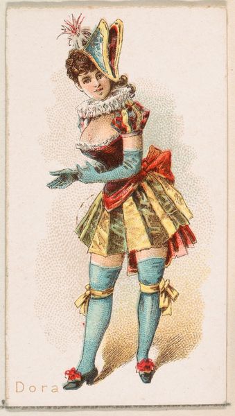 Editor: This print, "French Shepherdess Dancer," comes from the "Dancing Women" series by Wm. S. Kimball & Co. dating back to 1889, crafted with colored pencil. It feels like a glimpse into a theatrical fantasy. What's your take? Curator: I'm interested in the material conditions that enabled its production. This print was distributed by a tobacco company. What does it tell us about the rise of mass consumerism and the role of art within that system? Were these images aimed at a specific class, and what kind of labor was involved in making and distributing such prints? Editor: I see your point! I hadn’t really thought about the labour involved, and it's not exactly what you think of when looking at art in a museum. So how does understanding its origin as a commercial product change our perception of the dancer? Curator: Precisely. Rather than solely focusing on the aesthetic representation of the woman, we can analyze the materials—paper, ink, colored pencils—and the processes involved in reproducing the image on a large scale. The "dancer" becomes secondary to the materiality of the print itself and the socio-economic context surrounding it. It invites consideration of the work as a form of consumption. Do you consider her gaze complicit, defiant, or maybe disconnected from the transaction? Editor: I never looked at art this way. It’s fascinating to think about how these seemingly simple prints reveal a complex relationship between art, labor, and consumer culture. Curator: It's about expanding the frame and considering the tangible elements, not just the represented subject. That awareness, in turn, opens to how our own viewing is produced, what social functions it serves. Editor: Right, it's a challenge to move away from just what the artist is trying to say but more broadly, how this was made and used within a consumerist world. It provides a new appreciation.