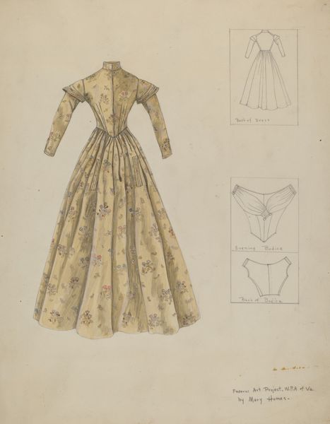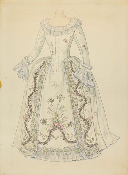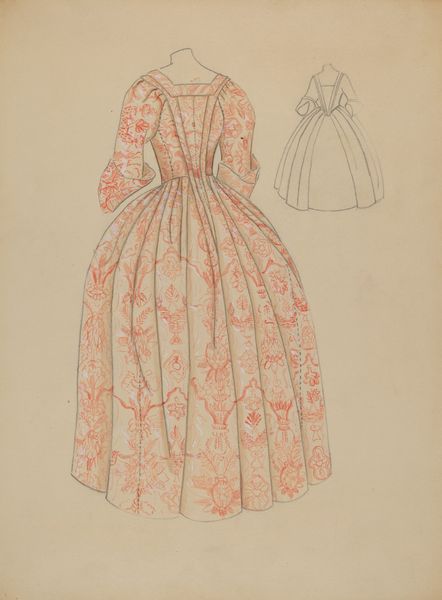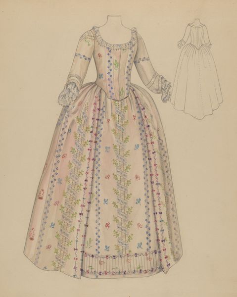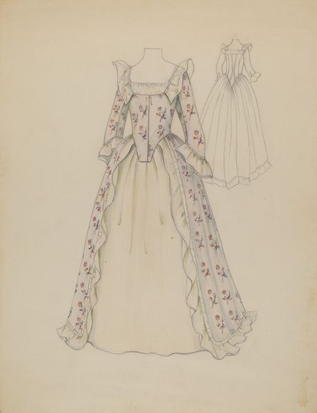 Dorothy Gernon made this watercolour and graphite drawing of a gown, though we don't know when. The subject appears to be a design for a court dress, like those worn in the 18th century. But what does it mean to revisit such a style in the 20th century? We can consider this image in relation to the history of fashion as a cultural phenomenon. What does it mean to conjure the clothing of the past? Gernon's gown evokes the lavish, formal, and aristocratic fashions of pre-Revolutionary France. This speaks of formality, social hierarchy, and the power of display. She also includes six different fabric swatches. The design might be interpreted as a conservative homage to tradition or a progressive critique of contemporary fashion. Art historians can use fashion magazines, historical archives, and museum collections to shed light on the changing role of clothing in constructing social identities. In the end, the meaning of such an image remains open to debate.