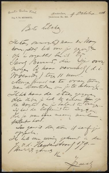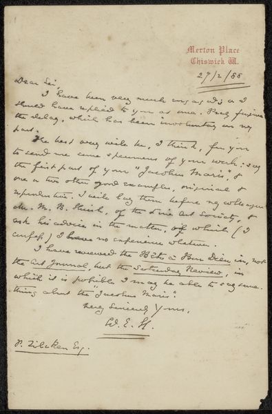 This letter was written by William Ernest Henley to Philip Zilcken in London on August 26th, 1889. This piece of correspondence offers an intimate glimpse into the late 19th-century art world, revealing the intricate networks of artists, critics, and patrons that shaped artistic production and reception during this period. Henley's inquiry about Mancini and Jongkind, along with his request for the names and dates of Ter Meulen's writings, underscores the importance of artistic lineage and influence within the institutional framework of art. The mention of Willem Maris and "the Silvey" suggests a shared understanding of artistic trends and critical discourse. Henley’s letter is more than a personal note; it is a document of cultural exchange, reflecting the values, priorities, and social dynamics that governed the art world of its time. Letters like this, along with exhibition catalogs, artists’ biographies, and period publications, are crucial for understanding the institutional histories of art.