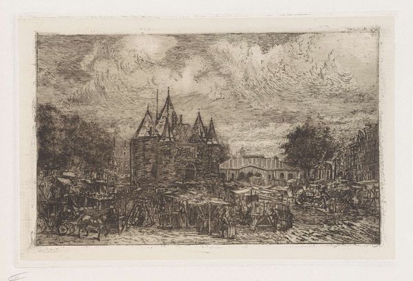 Curator: Looking at this scene, there's an immediate stillness, almost a hushed reverence. The church seems to dominate the landscape. Editor: Indeed. We're observing an engraving entitled "View of a Church in a City on a River" by Willem Linnig II, likely created sometime between 1852 and 1890. Its realistic approach is particularly notable for the era. Curator: It feels incredibly symbolic. The towering church, framed against that almost turbulent sky... churches of this size often symbolize not just religious power, but also the established social order. This is definitely more than just a rendering of a pretty skyline. Editor: Precisely! The church as a symbol of stability amidst the potentially chaotic movement in the heavens. The use of linear perspective draws our eye directly to it, reinforcing the institutional dominance and visual message it was giving off at the time, not to mention its association with societal wealth and control. Curator: It's interesting how the surrounding town seems almost subservient to the church's presence, wouldn’t you agree? A sense of community under the Church's large watchful eye. Do you get a feel of melancholy coming off the image? The monochrome style seems to capture a lost history, almost a past memory. Editor: The buildings' repetitive forms could definitely represent the populace. Realism in this instance helps convey the visual power dynamics that helped shape community relationships within the Church during those eras, wouldn't you say? The somber quality could reflect both personal memories of Linnig as the artist and even some social anxiety. The artist's own relationship with social norms could have helped construct what many describe as sadness. Curator: Absolutely. The print offers a fascinating, visual gateway to understanding not just a cityscape, but the historical forces that helped create that period of cultural evolution and development. It's striking to imagine the weight this building held, culturally and politically, over the everyday lives depicted here. Editor: I agree. Examining the interplay of iconographic symbols within the context of its creation period definitely adds multiple layers to appreciate this cityscape through this perspective.