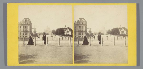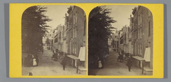 Curator: Here we have Pieter Oosterhuis's gelatin-silver print, "Gezicht op de Marktstraat in Arnhem," placing us somewhere between 1860 and 1885. Editor: Immediately, the subdued tonal range strikes me. It lends the street an almost dreamlike quality, like a half-remembered memory. The vertical lines of the buildings dominate, providing a stark contrast to the soft focus elsewhere. Curator: Yes, the pictorialist aesthetic at play is definitely softening those harsh photographic realities of the time. Notice how Oosterhuis carefully arranges the figures, not just as inhabitants but as integral elements in the visual scheme. Editor: Absolutely. They’re placed just so. But what I find particularly evocative is how they're caught in mid-action. Look at the figure bent at the waist! It triggers curiosity – what's dropped or been lost, and how is their presence embedded in this thoroughfare? Curator: Interesting. I am more captivated by how that specific figure directs our gaze deeper into the composition. That pull is further activated by the repeating architectural patterns, culminating in that barely perceptible building nestled far in the distance. A brilliant strategy of pictorial depth. Editor: The very lack of sharp definition pulls it together. Even those indistinct trees bordering the street suggest an untamed natural world just beyond this ordered reality, juxtaposing the structured urban space with something wilder and older. I feel this tension palpably. Curator: And in capturing this transitional moment, Oosterhuis grants the seemingly ordinary street a timeless quality, where the interplay between light and shadow transcends mere documentation, edging towards art. Editor: So true. It prompts you to meditate not just on Arnhem then, but on any street, any time. It invites speculation, an imaginative connection to a shared human past through something as banal as a bent back or passing pedestrian. Curator: It really makes one contemplate how even everyday scenes possess underlying abstract beauty, unlocked through skillful observation and intentional image-making. Editor: I will agree, Oosterhuis has masterfully created a layered cultural image – triggering personal experiences but remaining universally poignant in its impact.
