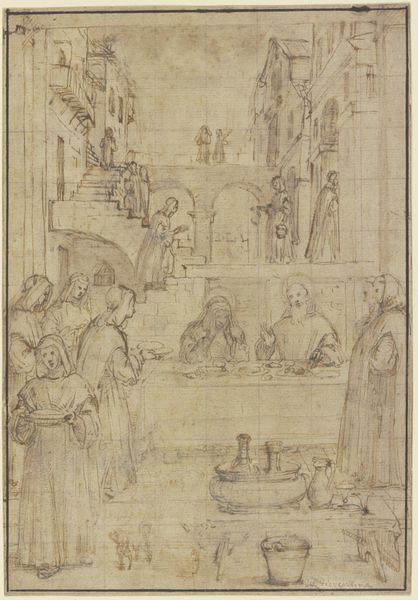 Curator: Let’s take a closer look at "The Circumcision" attributed to Giovanni Battista Cungi, dating from around 1500 to 1569. It’s rendered in pen, ink, and charcoal drawing on paper. Editor: Immediately, I’m struck by the subdued palette and the intense concentration on everyone's faces. It’s not gruesome, but somber, almost reverent. The medium reinforces this, quite literally drawing us into the scene with thin and thick pen strokes that gives some characters and forms volume while leaving others nearly flat. Curator: Yes, and Cungi utilizes the artistic conventions of the Italian Renaissance, focusing on narrative-driven history painting—it captures a pivotal moment in religious history, emphasizing institutional continuity and faith. Consider how this piece might reflect on the values promoted and upheld within a specific historical and societal context, one built with the authority of art! Editor: What's most compelling for me, though, is the emphasis on process evident in the layering of the ink and the artist's approach to applying color. Notice how the use of varied drawing materials, coloured pencil and penwork combined to achieve an extraordinary result with depth and shading of forms. What can this tell us about artistic labour and practice at the time? Curator: I agree the drawing quality demonstrates Cungi’s commitment to traditional rendering and technique, showcasing the value that training held at that time. How the consumption of art by wealthy patrons shaped those practices, is what fascinates me! It highlights that the value placed on the work itself influences its reception within specific settings like wealthy households and later museums. Editor: The artwork brings the sacred moment into an immersive artistic space—even despite its modest scale. A powerful display that evokes the tactile qualities, in service to storytelling through labor-intensive creation processes Curator: A brilliant example of the confluence of cultural heritage, artistic tradition and visual artistry; I'm thinking a closer look at who held this type of piece in their private collections could bring some of these themes to life for visitors!