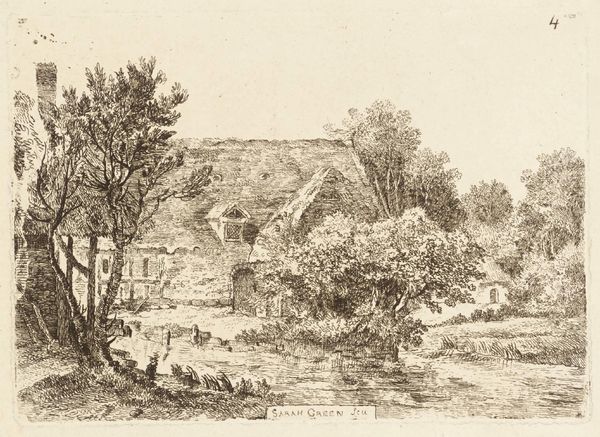 Here is an etching by Hermanus Fock, made circa late 18th-early 19th century. At first glance, the eye is drawn to the thatched farmhouse, its textured roof and worn walls rendered with intricate detail. Fock masterfully uses the etching technique to create a visual language of lines and patterns. Notice how the hatching and cross-hatching not only define the forms but also create a sense of depth and volume, inviting us into this rustic scene. The composition is structured around the interplay of light and shadow, with the dark lines emphasizing the rough texture of the building and the surrounding foliage. This formal tension between light and dark is further complicated by the arrangement of shapes. Fock destabilizes the traditional landscape genre by focusing on the unidealized aspects of rural life. Consider the dense network of lines and how they challenge our perception, inviting us to look beyond the literal representation. The etching captures a moment in time, and also invites us to contemplate the complex relationship between art, representation, and the materiality of the natural world.