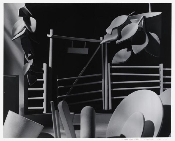 Curator: This is James Casebere's "Dining Room with Corral." Notice the stark contrast, almost theatrical in its staging. Editor: Yes, the composition, with its play of light and shadow, feels meticulously structured, like a stage set. It evokes a sense of stillness and perhaps even isolation. Curator: Casebere is known for constructing miniature architectural models, often evocative of societal structures and control. The corral, contrasted with domestic objects, hints at boundaries and confinement. Editor: The formal elements – the simple bowl, the dark void – invite a semiotic reading, suggesting absence, loss, or even a primal connection to earth and shelter. Curator: I agree; the image resonates with broader historical and cultural anxieties, particularly regarding land use, ownership, and the human impact on the environment. Editor: Ultimately, the artwork's power lies in its ability to communicate through form and structure, allowing for multiple interpretations beyond any fixed narrative. Curator: Exactly, and by confronting those tensions, Casebere provokes reflection on the social constructs shaping our experience.