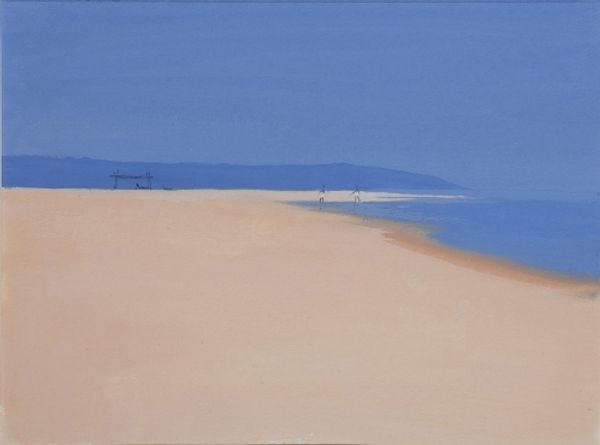 Editor: Here we have "Beach with Palm" painted in acrylics, author not specified. What immediately strikes me is the near-monochromatic, somber mood, the blue is intense. What do you see in this piece? Curator: It's an interesting subversion of the typical tropical landscape, isn't it? Usually we associate beaches with bright, saturated colours, sunshine, leisure, and yet this muted palette evokes a different kind of feeling. How does this stylistic choice influence our understanding of leisure, or paradise? Perhaps it reflects a more complicated relationship with these spaces, considering themes of colonialism, environmental exploitation, and the commodification of nature. Think of the romanticisation of the "exotic" in art, how it often erases the realities of local populations. Editor: That's fascinating. So you're saying the painting challenges our expectations of a "happy" beach scene? Curator: Exactly. It prompts us to question who gets to experience this paradise, and at what cost. Consider how tourism impacts local communities and environments, transforming natural landscapes into sites of consumption. The absence of people in the painting could also be significant, no? Are we meant to see this beach as pristine and untouched, or deserted, reflecting a deeper sense of alienation? Editor: That makes me reconsider my initial response entirely. I was just seeing it as a stylistic choice, but I hadn't thought about its historical implications, and that helps it all make sense. Curator: Art has this powerful ability to conceal political meaning behind beauty, a trick, like the "white cube" of a gallery: Who decides which messages can come in and what meanings can take place? Editor: Definitely, I see it in a new light now! Thanks for this intervention, its implications, so simple at first, have left me speechless! Curator: Likewise, your observations offer new perspectives on my work as well.