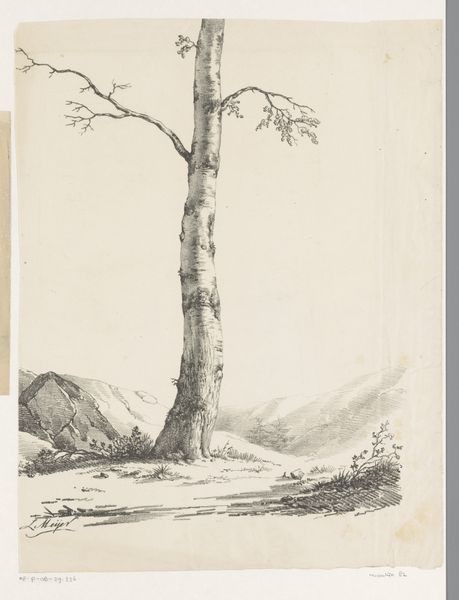 Curator: So peaceful! Like stepping into a hazy memory, a warm, ordinary moment frozen in time. Editor: Indeed. This is "Landschap met vrouw die de was op hangt," or "Landscape with Woman Hanging Laundry," a drawing made around 1840 by Paulus Lauters. It combines pen, graphite, and drawing techniques to create a realistic depiction of daily life. Notice how much texture he builds using simple marks. Curator: I see more than realism. The almost bare tree looms over the woman, and she seems so small against the weight of her task. Laundry – it's repetitive, mundane, almost timeless. Yet there is a subtle beauty that's so present in all this! Editor: The materiality contributes, doesn’t it? Laundry signifies cloth, labor, consumption – it is intrinsically intertwined with the very tangible, felt processes of living and sustenance. And what a brilliant choice by Lauters to picture an activity often considered 'women's work', pushing against the traditional boundaries of artistic subject matter. Curator: The social context interests me: that quiet intimacy, almost private, framed within nature's gentle embrace! Was it perceived radical at that time to depict such domestic work so plainly, I wonder? What did viewers really take away from images such as this? Editor: Given its presence here in the Rijksmuseum, one could consider that in choosing a scene rooted in everyday existence, Lauters elevated domestic labor – granted value beyond simple function to the sphere of art. And then, the simplicity in means of production mirrors, in some ways, the modesty of the subject matter itself. Curator: That feels quite true. I'll never look at doing laundry quite the same again. A mundane act now imbued with profound contemplation and recognition of life! Editor: Yes, an insightful look at the beautiful textures and often unseen labors embedded into everyday moments.