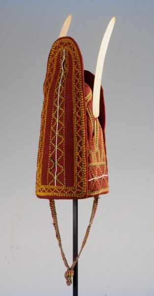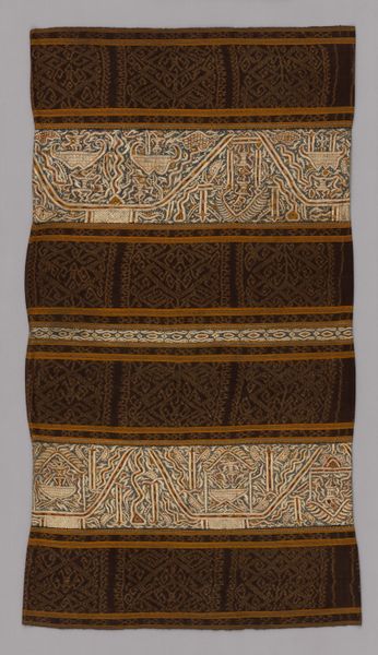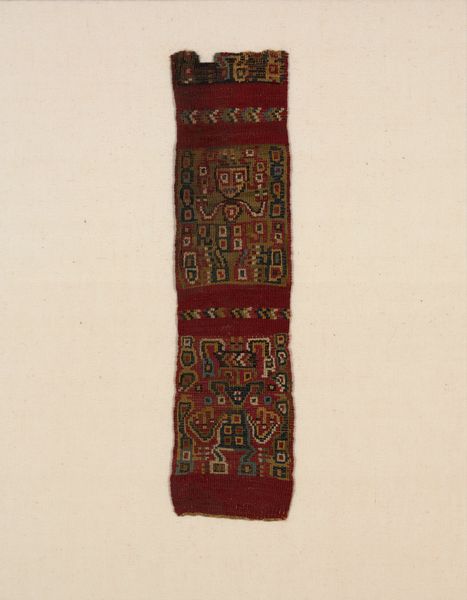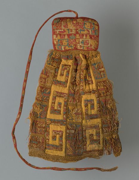 Editor: Here we have a fascinating textile from the Nazca culture, titled "Tassel," dating from 500 to 900 AD. The geometric patterns are quite striking, almost like a maze. How do you interpret this work within its historical and cultural context? Curator: The Nazca people, flourishing in ancient Peru, placed significant cultural weight on textiles. Weaving, unlike painting or sculpture in our Western art tradition, was a primary medium for social and religious expression. These weren't merely decorative items, but rather, they communicated status, ritual significance, and cosmological beliefs. Notice the complexity of the geometric abstraction. Do you think that complexity affected how people understood its purpose? Editor: I hadn’t considered that the complexity itself might have held meaning. Did specific patterns relate to specific social roles, or perhaps religious practices? Curator: Exactly. Historians often link such geometric motifs to Nazca pottery designs and, perhaps more speculatively, to the famous Nazca Lines. They suggest that some of these patterns reflect shamanistic visions, ancestor veneration, or agricultural cycles. Remember that the museum context frames our viewing experience. This tassel might have been originally displayed or worn in entirely different social contexts - burial sites or ceremonial events, potentially affecting the social response. Editor: So the original function significantly changes how we understand its place within society. It's less about aesthetics in our modern sense, and more about its role within a belief system. Curator: Precisely. Our Western concept of “art” often imposes a limited frame. Considering the original social and political roles is vital. Editor: That makes so much sense. I'll never look at textiles the same way again! It highlights how objects carry their social history with them, reshaping our perception. Curator: Indeed! Seeing art as a form of social commentary and practice. Always consider how we are influenced by its display as an object.