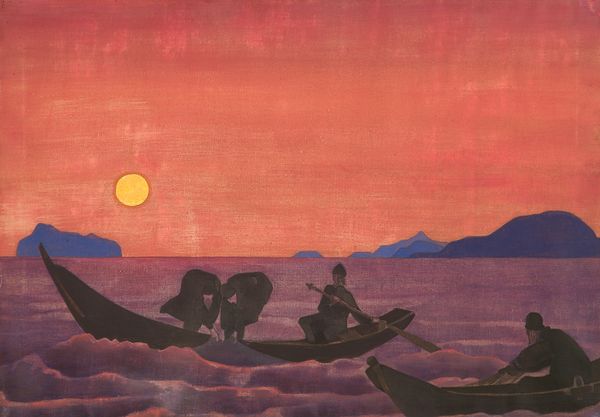 Curator: Nicholas Roerich’s "Voice of Mongolia," painted in 1937, offers a compelling symbolic landscape. Editor: It's ethereal. Those horizontal cloud formations give me a sense of wide-open space and also this sort of weighty calmness pressing down from above. Is it oil? You can almost feel the canvas texture. Curator: It is believed to be an oil on canvas. The composition directs us to consider symbolic readings of the horse and riders silhouetted against the radiant sky. Roerich was deeply influenced by Theosophy, which greatly impacted his symbols and allegories of spiritual ascension. Editor: I'm curious about the pigments themselves, though. Was Roerich using locally sourced materials, grinding his own pigments perhaps, or was he working with industrially produced paints? This really changes how we understand the visual vocabulary on view. Were these colours easily attainable for someone else trying to do this style, or was it his proprietary artistic gesture? Curator: That's a great question, about which there isn't a definitive resource that I am aware of. Either case seems fitting to Roerich. The figures on horseback, of course, speak to a nomadic past and present, but there is something about how their positioning beneath the vibrant sky suggests not just physical travel, but also a spiritual journey and search for higher meaning. Notice the colours too - orange is about enthusiasm, happiness, and creativity while purple symbolises wisdom and spirituality. Editor: You can definitely tell Roerich's interest was more on representing a particular inner quality over realism. Did that impact what types of supports or production methods he used, as in was he focused on speed to capture feeling more easily rather than more refined details? This has implications about who the work would have been created for and shown to. Curator: Given his philosophical approach and fascination with archetypes and mystical quests, Roerich may not have given much importance to materialistic support; his symbolic lexicon appears intended to evoke universal spiritual values transcending the tangible world. Editor: Right, Roerich seems very much on the iconographic side in conveying spiritual insight that material production is clearly a conduit to accessing. It does invite speculation to what extent his materials are symbolic of that intention and larger process. Curator: Ultimately, "Voice of Mongolia" encourages us to contemplate the spiritual and symbolic weight carried by both landscape and those traversing it, regardless of the how its elements were attained. Editor: For me, looking at the materials this way definitely provides another way of contextualising Roerich's symbolic universe.